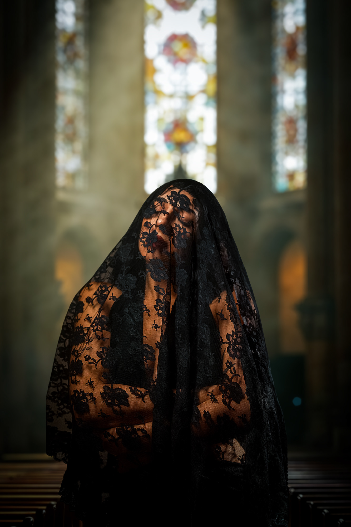La luce — un tratto distintivo del lavoro dell’autore — non illumina per rivelare, ma per suggerire: scivola sul velo, scolpisce delicate topografie di ombre, e lascia emergere un volto che sembra oscillare tra l’implorazione e la resa.